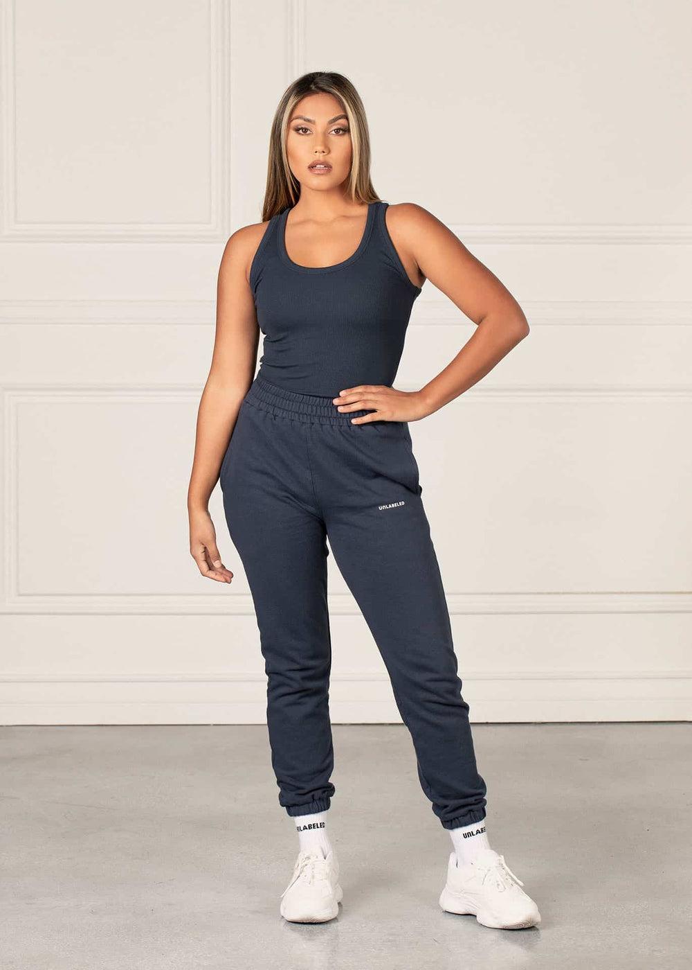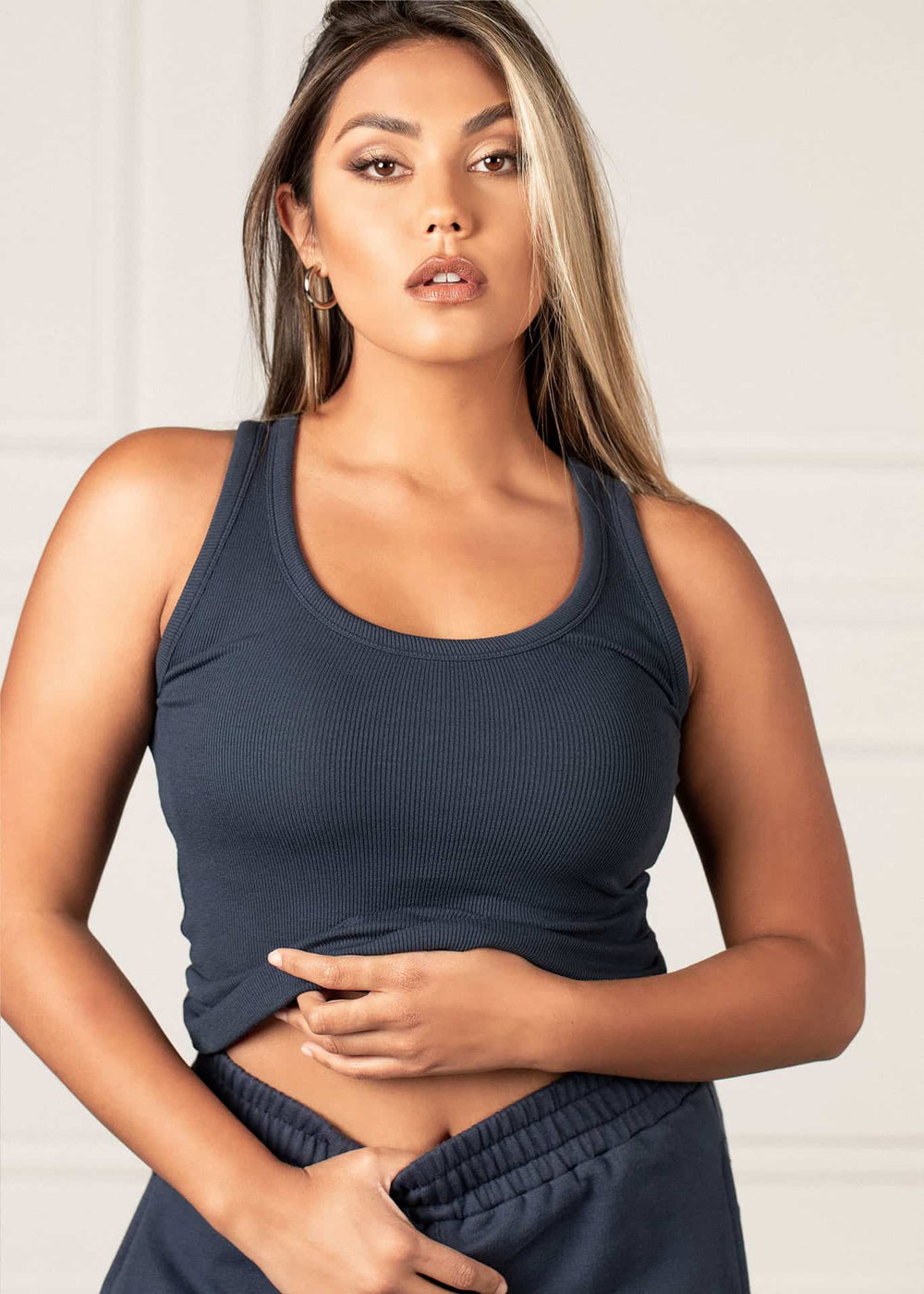 - Racerback tank with a U-neckline